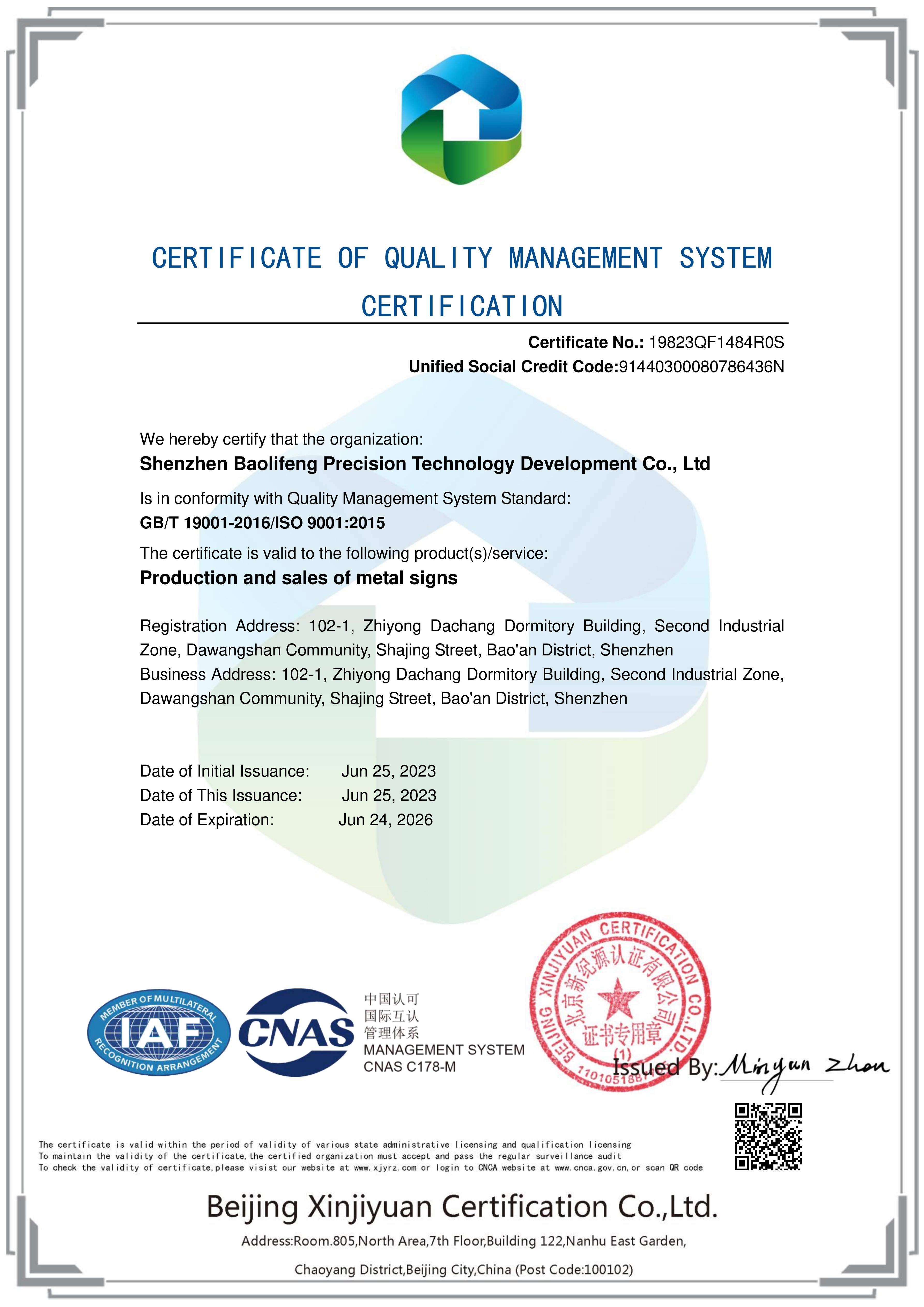 公司獲得金屬標(biāo)牌生產(chǎn)質(zhì)量管理體系認(rèn)證證書