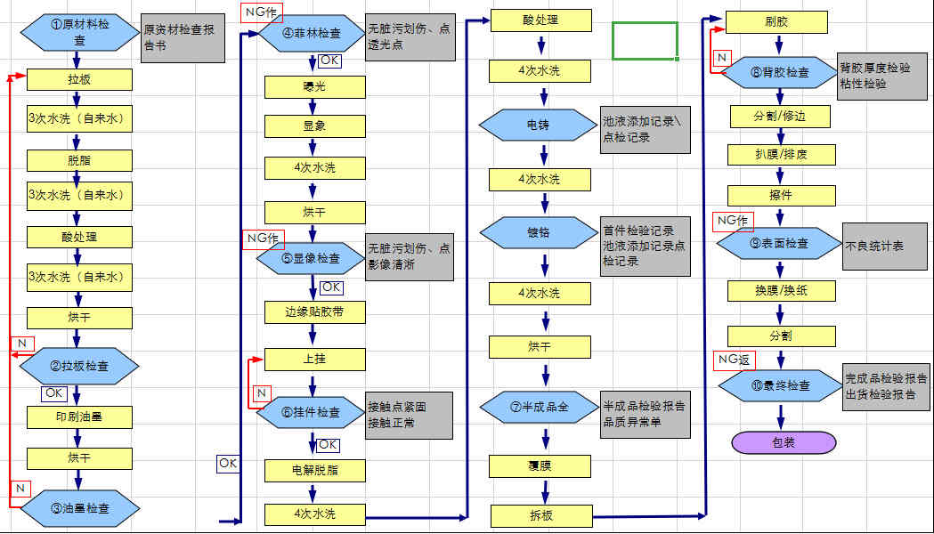 電鑄薄標(biāo)生產(chǎn)工藝大致流程為:原材料檢查→拉板檢查→油墨檢查→菲林檢查→顯像檢查→掛件檢查→電鑄→鍍鉻→覆膜→刷膠→背膠檢查→表面檢查→最終檢查→包裝